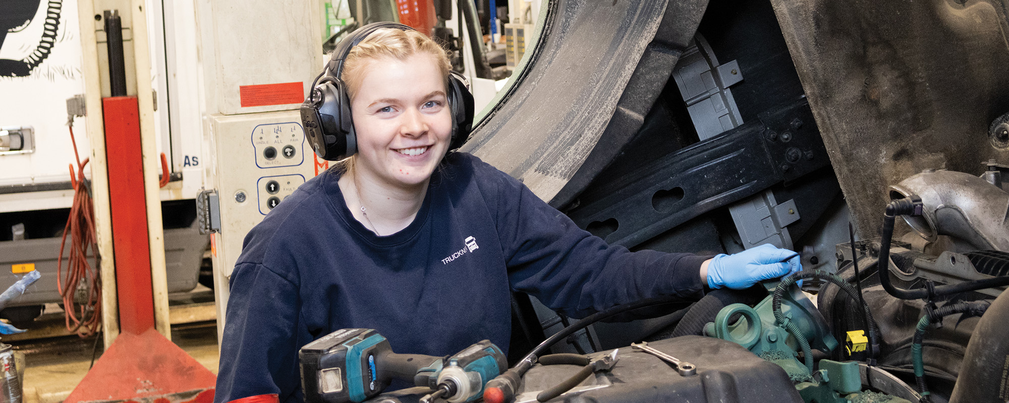 Mellom store lastebilar er det Ingrid Marie Vatne Rygg (20) trivs best. Ho er lærling i faget tunge køyretøy hos Trucknor Førde, men det er ikkje første gong ho jobbar her.